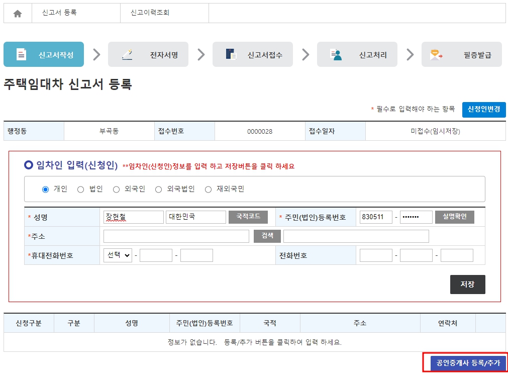 다음 페이지에 넘어가면 임차인 정보를 입력을 하라고 저렇게 빨갛게 되어있는데 저것 밑에 공인중개사 등록 이라고 되어있는 버튼도 눌러서 추가해주셔야 합니다.