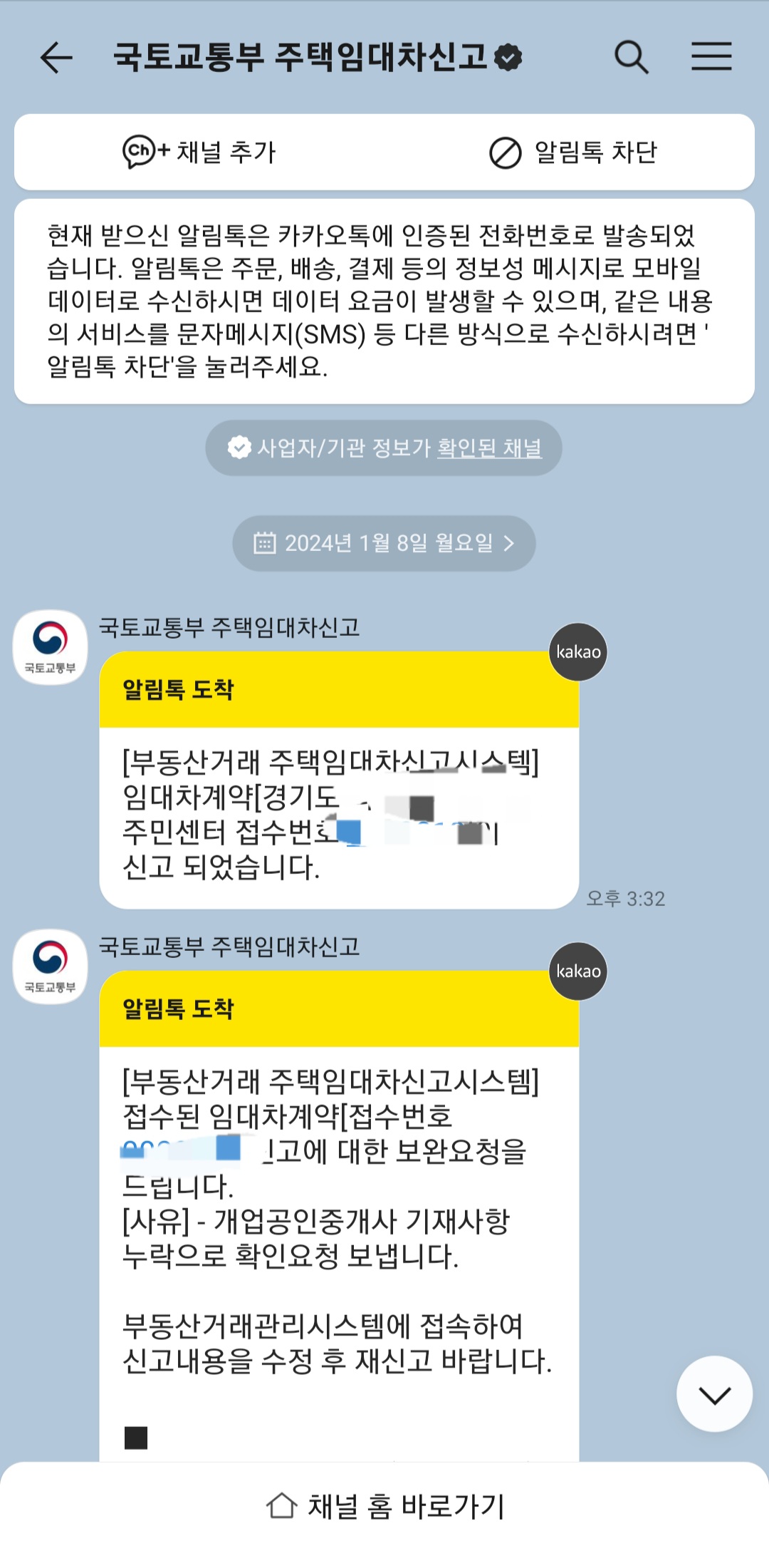 임대차계약신고를 마치시면 위와 같이 알림톡이 발송 됩니다.